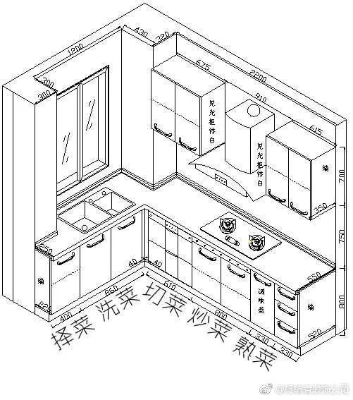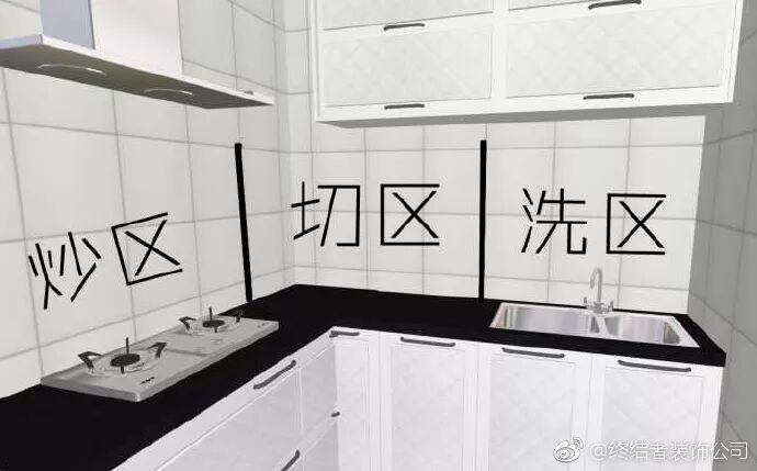 理想中的厨房根据洗菜(水槽)→切菜(台面)→炒菜(炉灶)按顺序进行排列,可以顺时针,也可以逆时针。